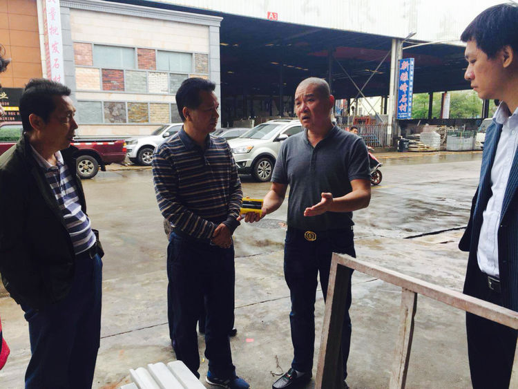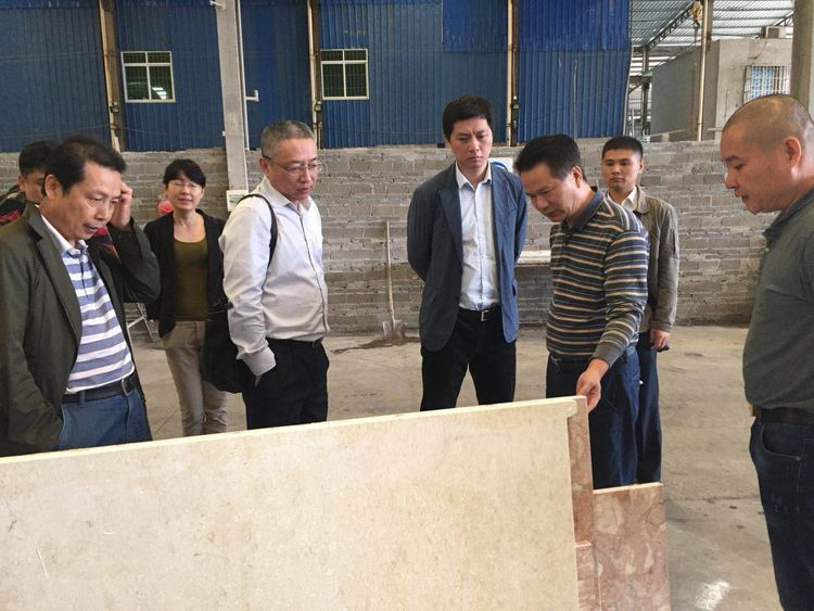 闽泉山公司吕青山总经理引领担保公司王治平董事长及随行人员参观石材仓库、加工厂等。