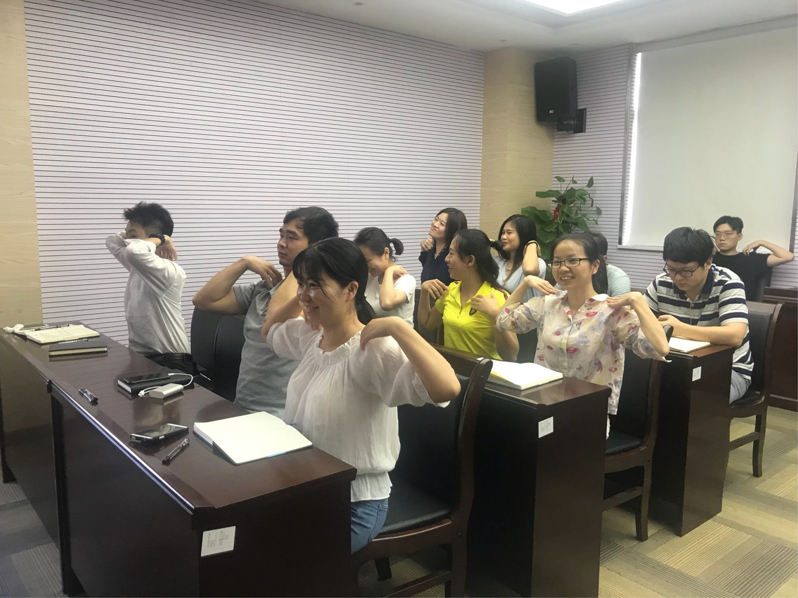 员工在教官的指导下进行颈椎病保健操