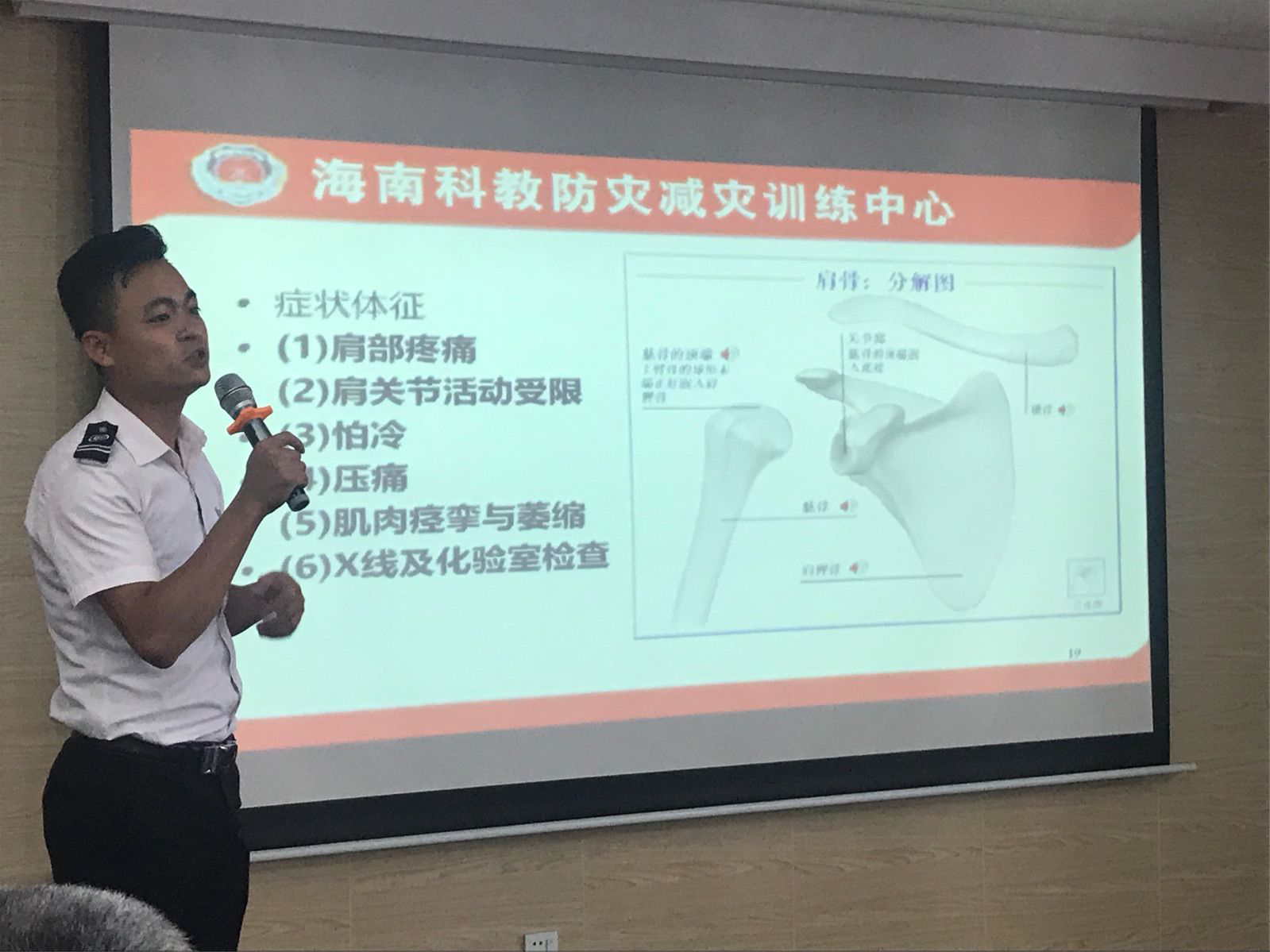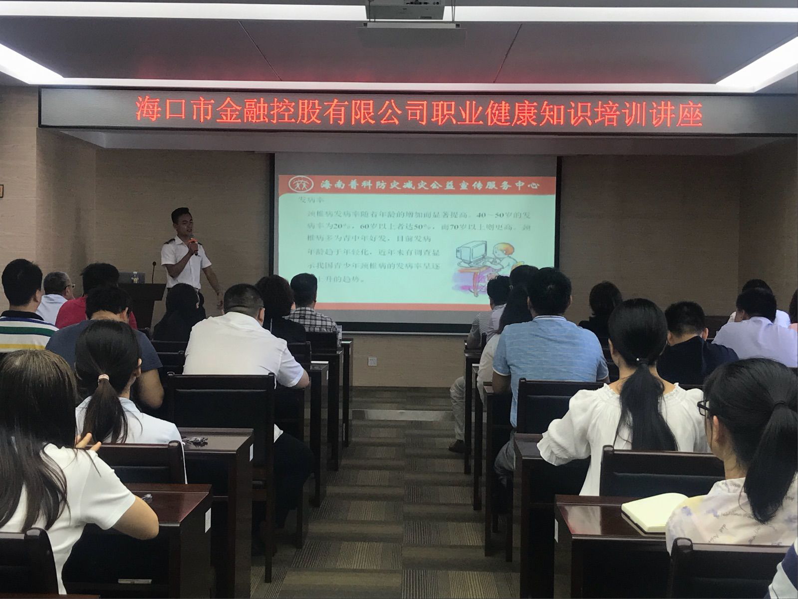 此次培训m88asia公司特邀海南普科防灾减灾公益宣传服务中心主讲教官陈建秋,为公司全体员工讲授职业疾病及慢性病(肩周炎、颈椎病等)的预防改善知识。主要内容有突发意外事故的自救与互救和办公室常见肩周炎颈椎病的防治。
