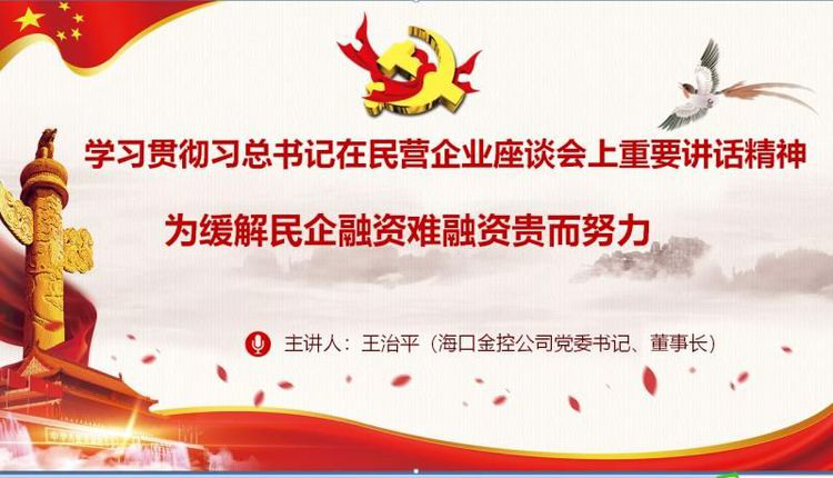 党委书记王治平同志以《学习贯彻习总书记在民营企业座谈会上重要讲话精神 为缓解民企融资难融资贵而努力》为题,向党员干部上了一次党课。本次讲课紧紧围绕如何加强国有企业党的领导,破解中小企业融资难融资贵难题这一主题,从习总书记召开民营企业座谈会的背景 、习总书记在座谈会上讲话的主要内容 、省委和省政府大力支持民营企业发展、海口m88asia公司致力于缓解民企融资难融资贵问题等四个方面进行了阐述。