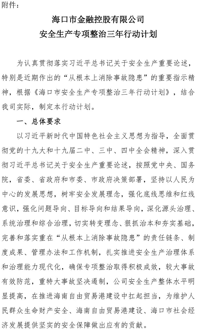 海口市金融控股有限公司关于印发《安全生产专项整治三年行动计划》的通知